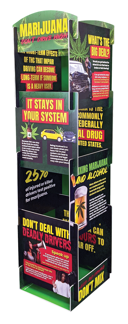 When it comes to driving, there’s no such thing as “high performance.” Step into the driver’s seat of marijuana and driving education and awareness with our Marijuana: Don’t Drive High Tabletop Info Tower. This display lays out the cold, hard facts about how cannabis use affects reaction time, decision-making, and overall driving ability. Whether for schools, community outreach programs, or safety events, this engaging tower makes sure your community understands the dangers of driving under the influence.