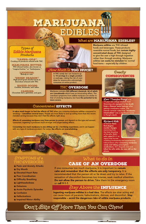 Our Marijuana Edibles Retractable Tabletop Banner gives a complete overview of the risks of consuming THC. The eye catching display outlines the dangers faced by edible marijuana users. More than just “hash brownies” or “space cakes,” marijuana edibles come in a variety of forms. Ranging from butter to chocolate bars, gummies, liqueurs, coffee, to list a few. Marijuana edibles contain high concentrations of THC and carry the risk of dangerous, oftentimes terrifying side effects. Don’t bite off more than you can chew!