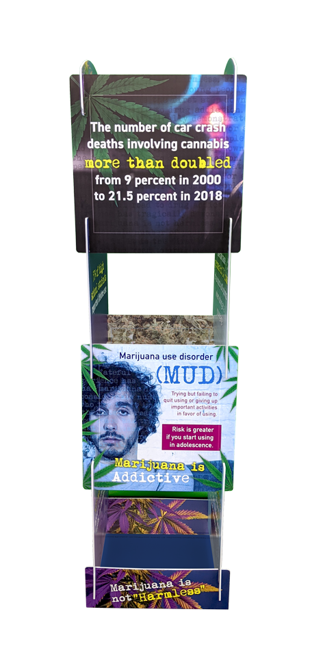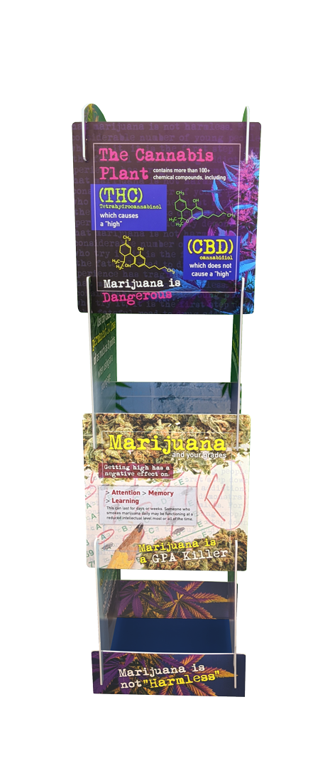 Additionally, The 8 interchangeable panels allow for a wide range of information to be presented. Including important facts about the effects of marijuana on the brain and body, risks of addiction, and more. Vivid graphics together with eye catching designs make this display tower a memorable and engaging resource for people of all ages and education levels.