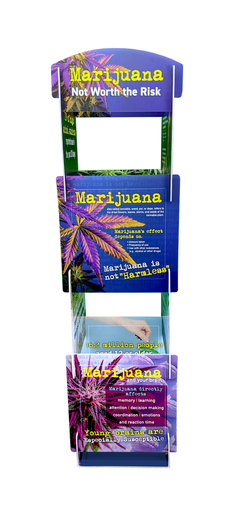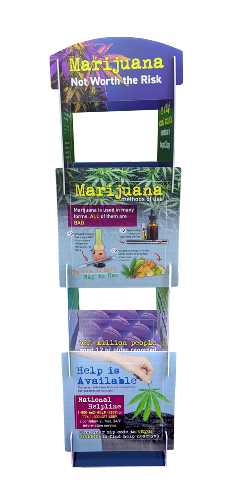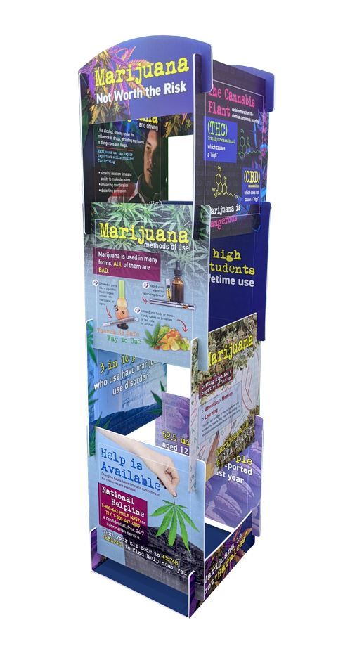 Promote informed choices and a drug-free community community with our Marijuana Prevention Info Tower. This tower is a powerful tool for educators and community leaders to raise awareness about the risks and dangers of marijuana misuse and abuse. The versatile 4-sided 360-degree viewing angle design ensures that the information is visible from all angles. Making this tower a great tool for use at public events and gatherings. Whether it’s at a school, community centers, or health fairs, this tower attracts attention and starts important conversations about marijuana use.