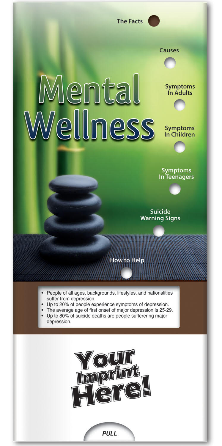 Educate your community about mental wellness with this easy to read brochure slider. What are the facts about mental health? Learn the early warning signs. Topics include recognizing the problem and symptoms in adults, teenagers and children. Find out how depression affects each gender. Interactive learning is easy with this sliding informational card. Each bullet point is augmented with interesting information provided through a clear viewing window. An ideal product for the doctors office, hospitals, spas, wellness centers and caregivers. They’re also a great way to promote your mental health awareness campaign.
