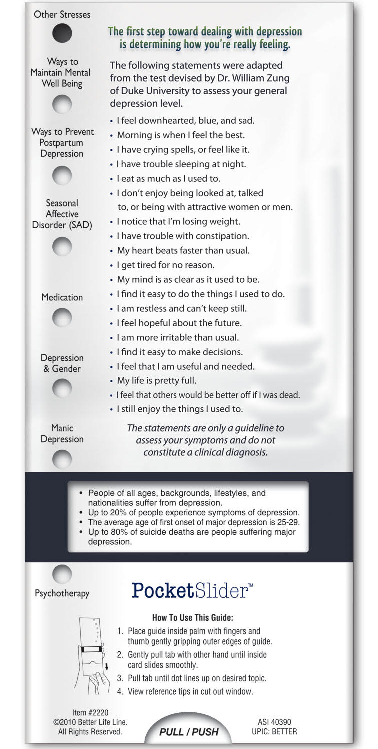 Sized perfectly for mailing in a #10 envelope. Printed on high quality card stock and gloss coating, with full color graphics, these two sided slide guides are both durable and fun to use. On the front of the slider is where you have the option of adding your custom message and/or logo. Customizing your slider is a great way to increase mental health awareness and gain exposure for your department or organization. The imprint area is large enough to display your logo and text for all to see, increasing your organizations visibility and further supporting your awareness program. What’s more, this slide chart is environmentally friendly, printed on recycled paper and made in the USA!