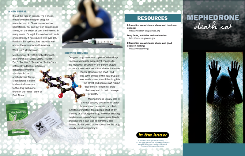 The In The Know: Mephedrone, Death Cat Pamphlet exposes this dangerous designer drug that has devastated Europe and has now come to North America. It’s as close as the local convenience store or Internet mail order shop. These brochures are your powerful tool for delivering vital information about Mephedrone, the ominous “Death Cat” synthetic drug.