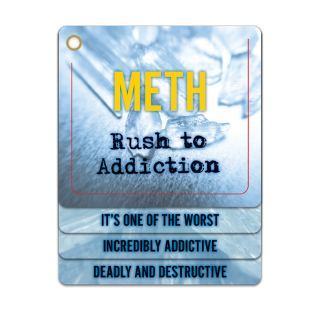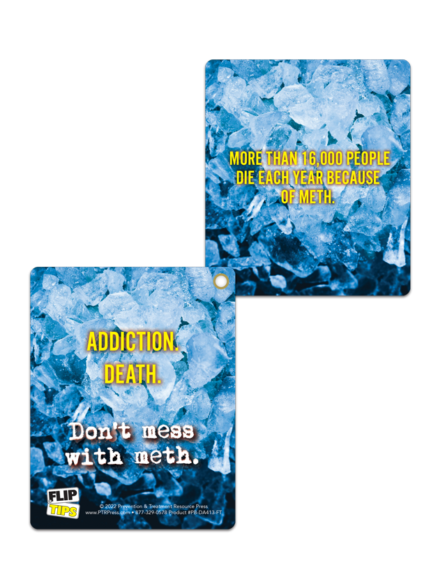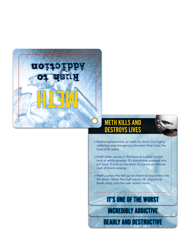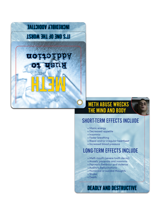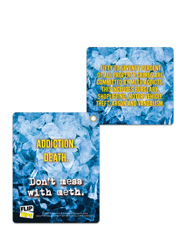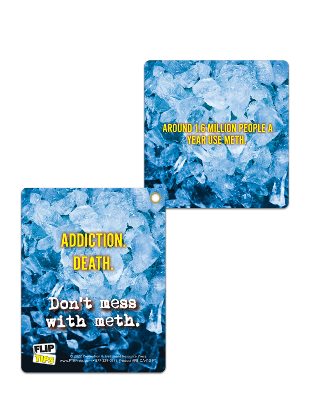 Defeat short attention spans when it comes to methamphetamine prevention with our new Meth: Rush to Addiction Flip Tips! These interactive handheld cards are packed with eye catching graphic and informative points that is sure to engage the young adult demographic. Each card includes only the most vital content to get the point across and keep reader’s attention. Prevention coordinators understand that using multiple learning styles, such as these cards, can make learning enjoyable and aid in retaining information. Small enough to take wherever you go and easy to hand out, Flip Tips are a great choice for any drug prevention program!