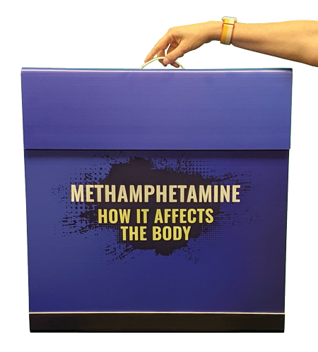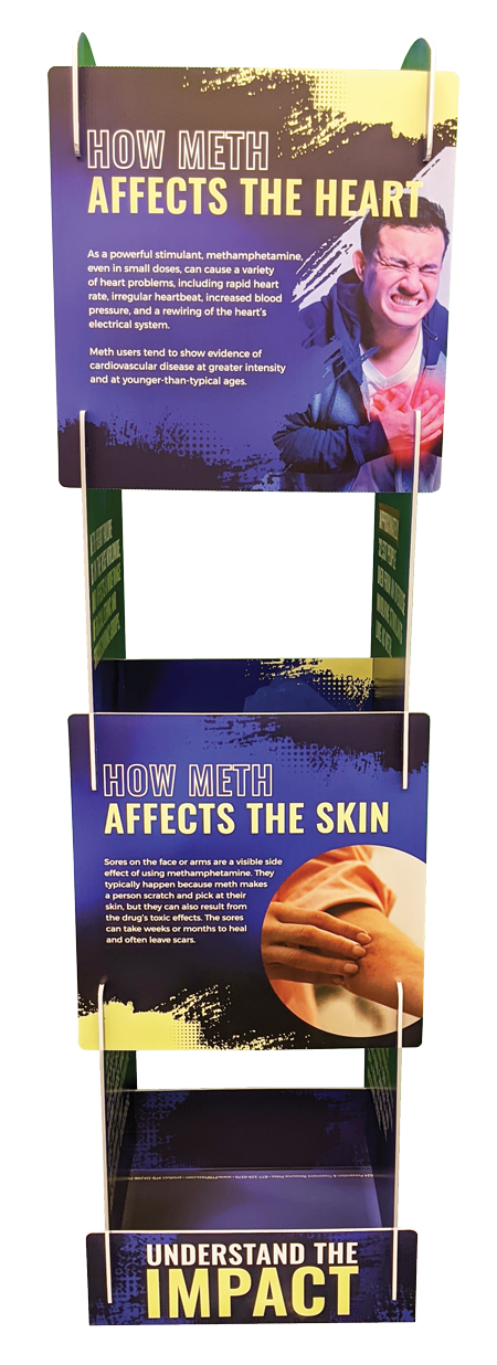 Reveal the dangers of methamphetamine with our ‘How it Affects The Body’ Info Tower. A powerful tool to understanding the dangerous impact of methamphetamine on the human body. Standing tall with 8 interchangeable panels, this Info Tower grabs attention and fosters understanding, making it a valuable resource for events. From the skin to the heart, teeth, and beyond, each panel sheds light on the toll methamphetamine takes on the body.