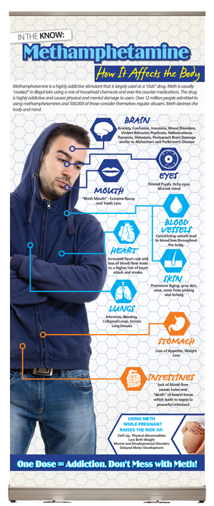 Bring the hidden dangers of meth to light with the Methamphetamine: How It Affects the Body Retractable Presentation Display. Featuring detailed graphics and clear, concise explanations, it breaks down the effects methamphetamine has on the body—from brain damage to heart issues and everything in between.