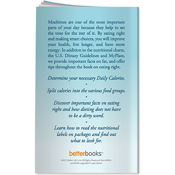 An ideal product for the doctors office, weight loss centers, fitness centers, nutritionists and more. They’re also a great way to promote your health education campaigns. On the front of the booklet is where you have the option of adding your custom message and/or logo. Customizing your book is a great way to increase healthy eating and nutrition awareness while also gaining exposure for your department or organization. The imprint area is large enough to display your logo and text for all to see, increasing your organizations visibility and further supporting your health program. What’s more, this book is environmentally friendly, printed on recycled paper and made in the USA!