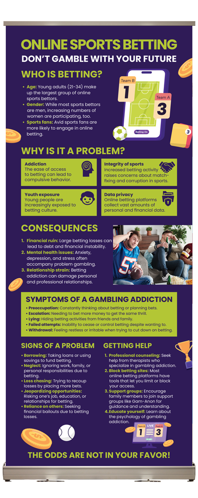 Online sports betting isn’t just a game, it can lead to real-world consequences. So order your retractable Online Sports Betting Presentation Display today and help spread the truth behind the bets.