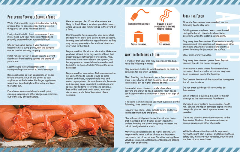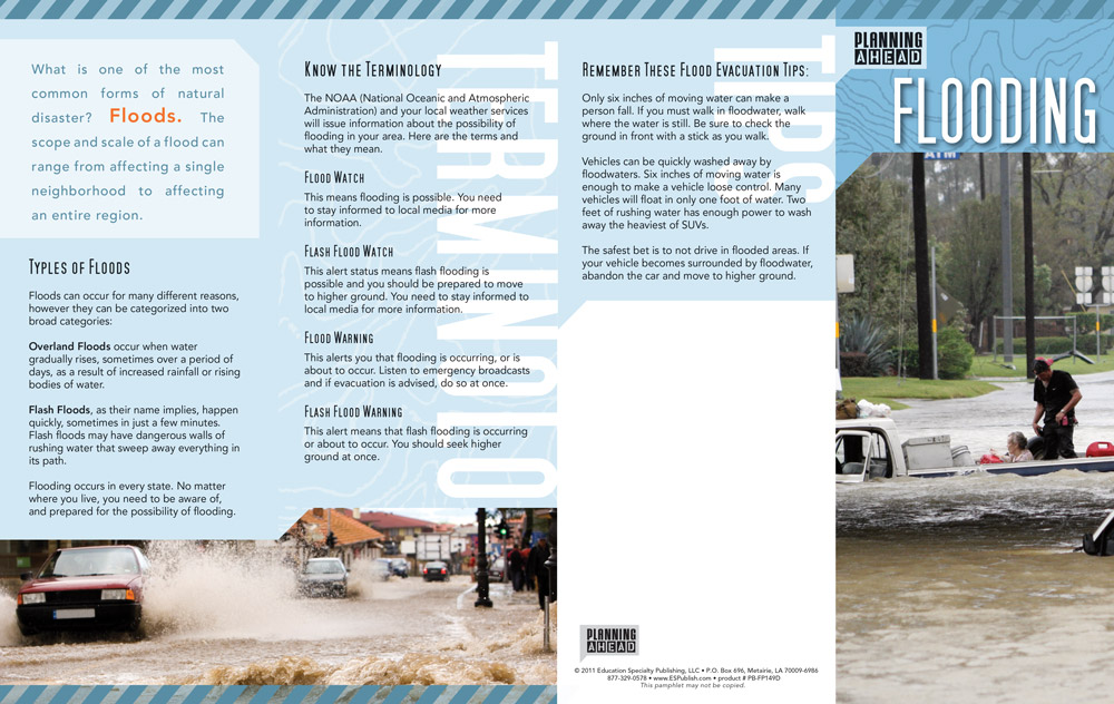 With the Planning Ahead: Flooding Pamphlet, readers will learn how to protect their family and home from a flood. This pamphlet is a must have resource for a variety of communities. Floods are the most common form of a natural disaster. The scape and scale of a flood can range from affecting a single neighborhood to an entire region. Having the right plan in place and following safety tips may save your valuables, your life and the lives of your loved ones. This brochure is a great resource that is sure to provide your community members with life saving information.