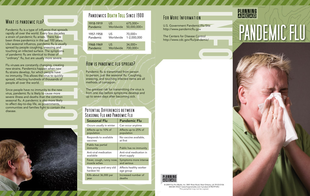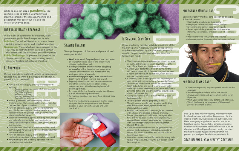 The pamphlet provides helpful tips to keep from contracting these viruses. To include, proper hand-washing and sneezing techniques, not sharing drinks, and disinfecting living areas. They will also learn what to do when someone around them is infected, how caregivers can stay protected, and how the government will respond. Make sure your community knows what to do before, during, and after a pandemic flu outbreak.