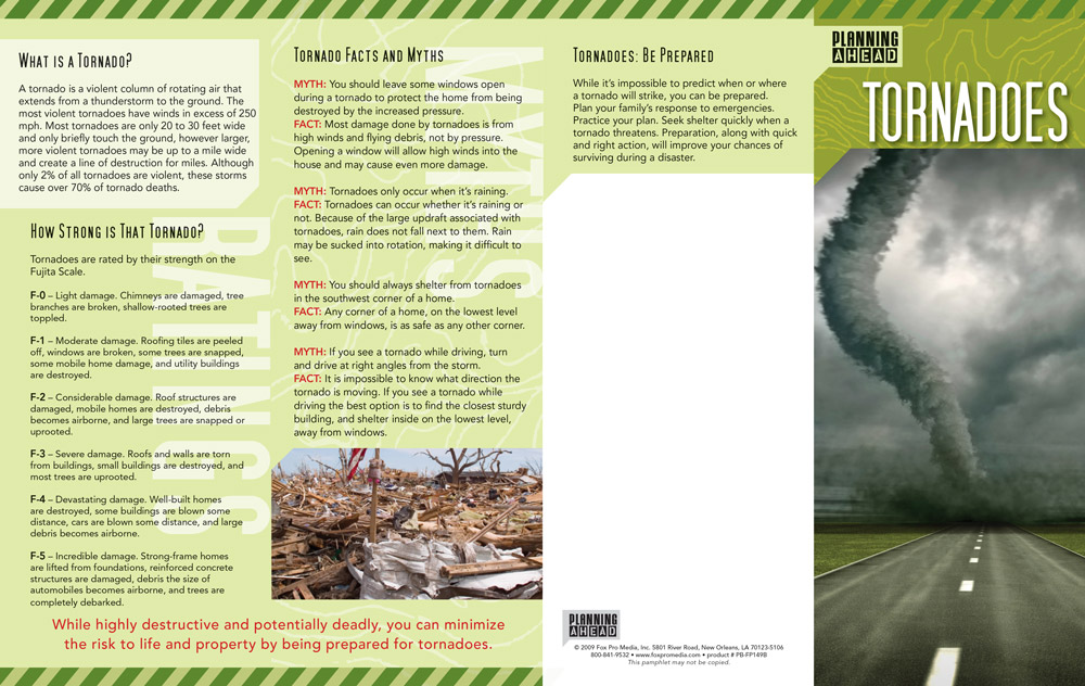 With the Planning Ahead: Tornadoes pamphlet, readers learn what to do in the event of a tornado. This brochure educates readers about the difference between a tornado watch and warning. Also how tornado strengths are measured, and the dangers of each category.
