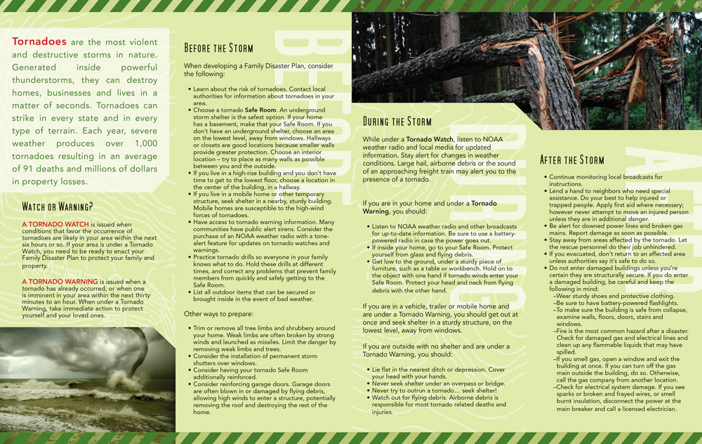 In conclusion, the brochure reminds viewers: “Minimize the Risk to Life and Property. Be Prepared for Tornadoes.”