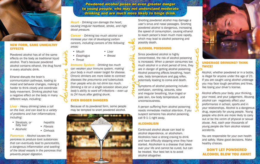 The brochure also provides an in-depth discussion of the unhealthy effects of alcohol abuse. Including damage to the heart, liver, pancreas, and immune system, as well as the increased risk of cancer and alcohol poisoning. Additionally, the powder form is particularly appealing to young people. Since it’s easy to conceal and can be taken to places where alcohol is prohibited. This can lead to risky behavior and decision making, putting the individual and those around them in harm’s way.