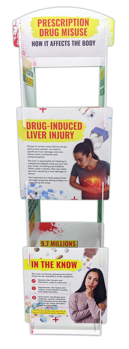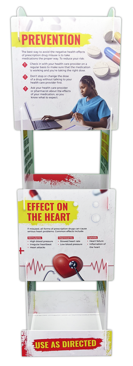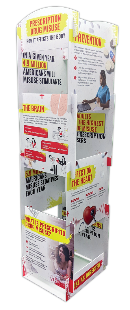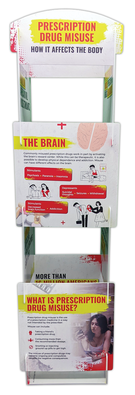 Discover the dangers of prescription drug misuse with our Tabletop Info Tower. With eight double-sided panels, this three-foot-tall tabletop tower covers everything from common misconceptions to the serious health risks of misuse, promoting vigilance and informed decision-making.