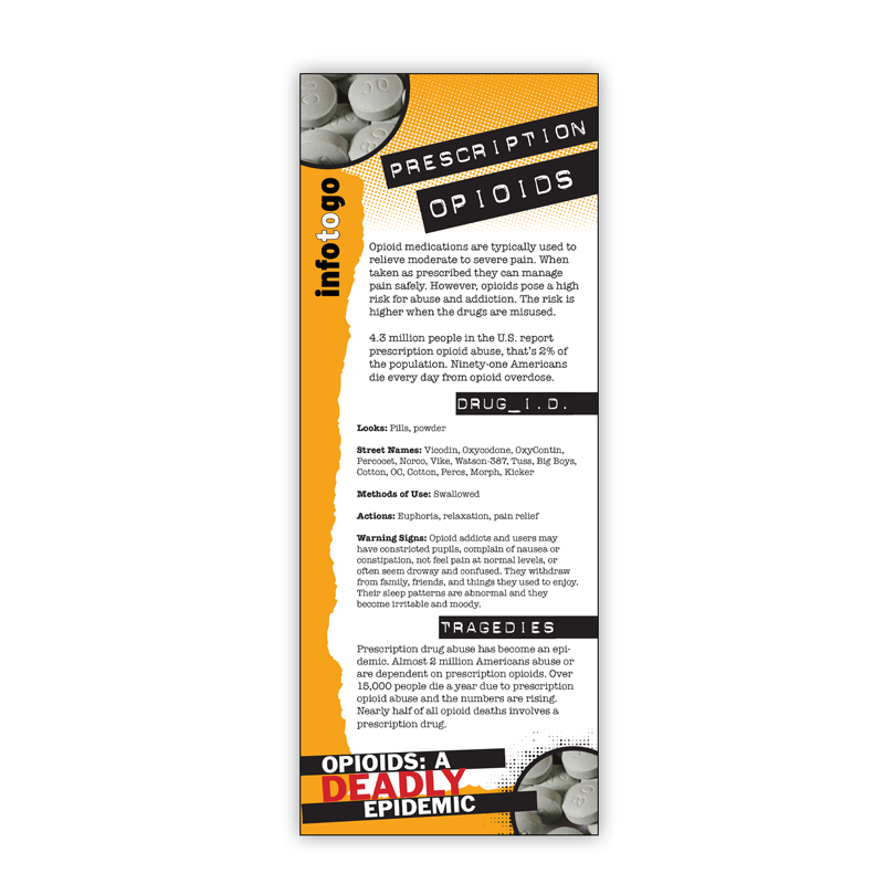 The Info to Go: Prescription Opioids rack card explains how these drugs wind up on the streets and are sold illegally. The card also explains that these drugs are highly addictive. It notes what prescription opioids are, how they are abused and eventually can lead to addiction and abuse of stronger opioids.