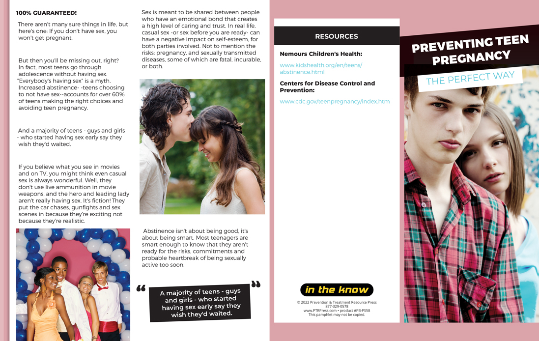 Are you passionate about promoting healthy choices and helping young people make informed decisions about their sexual health? With our pamphlet, teens learn how to prevent pregnancy in the perfect, no nonsense way – abstinence.