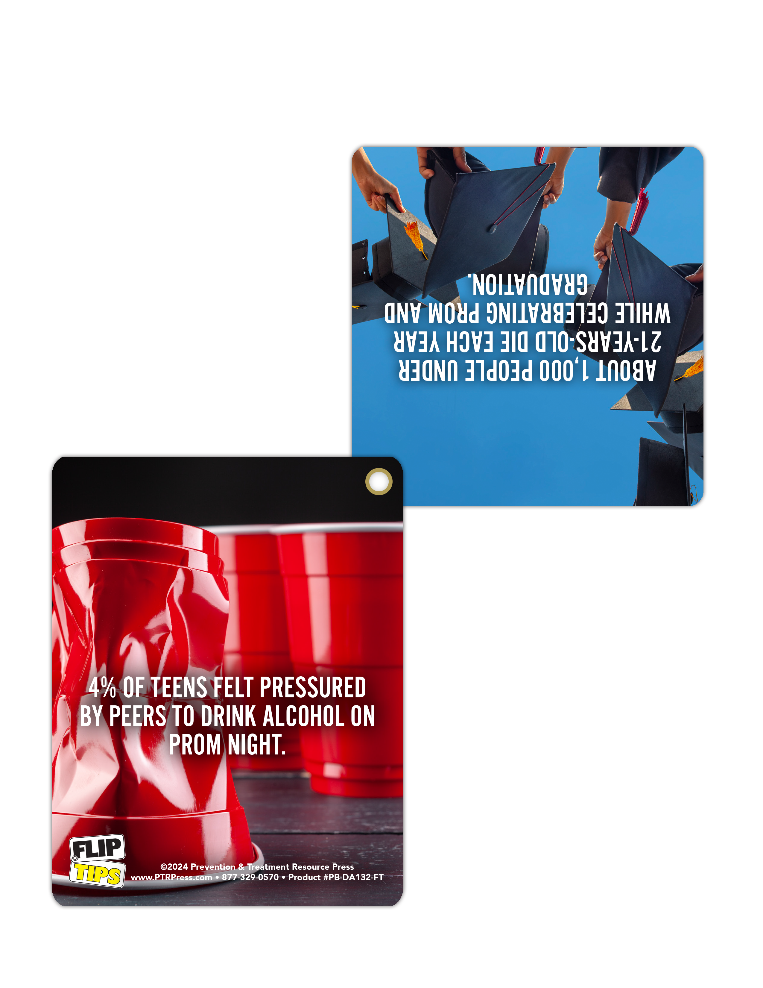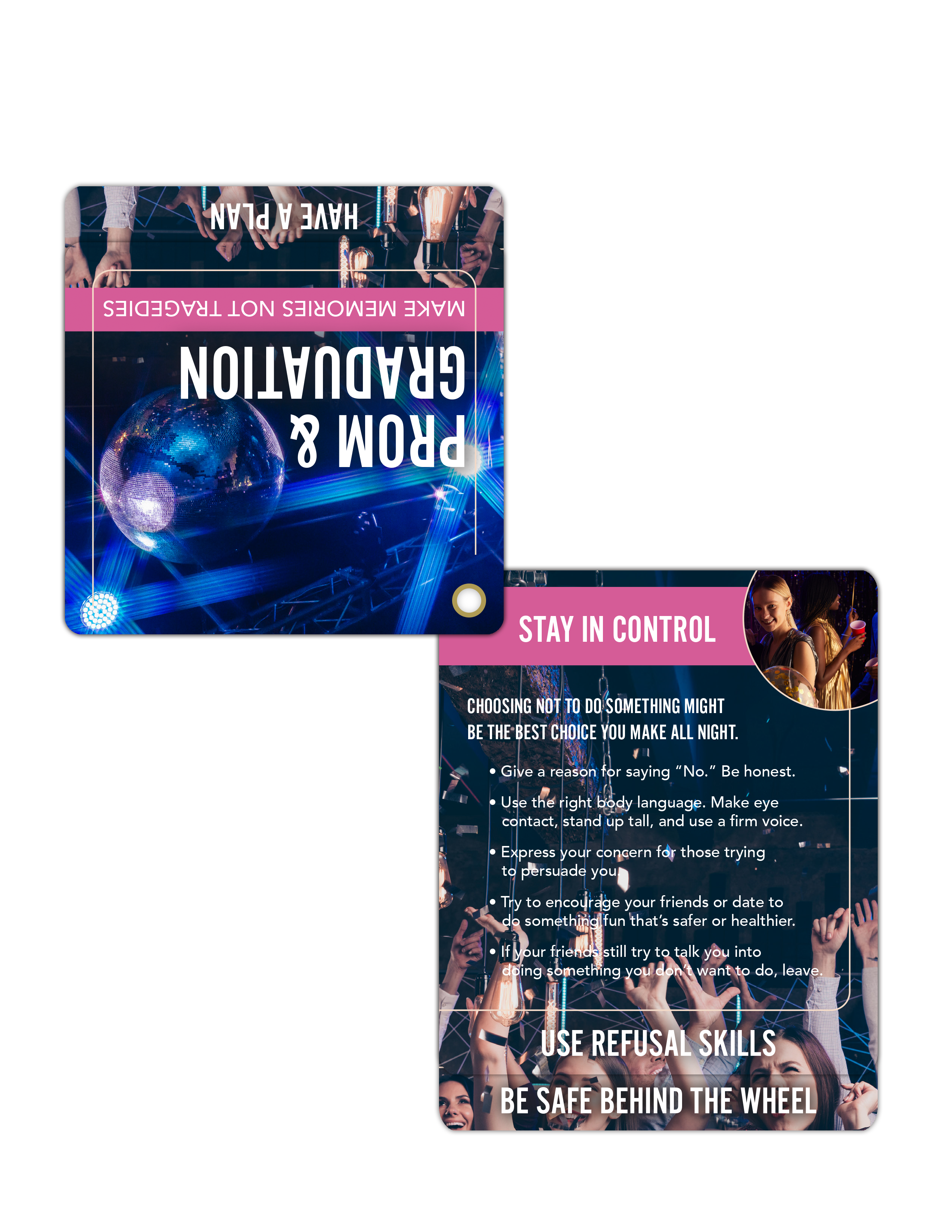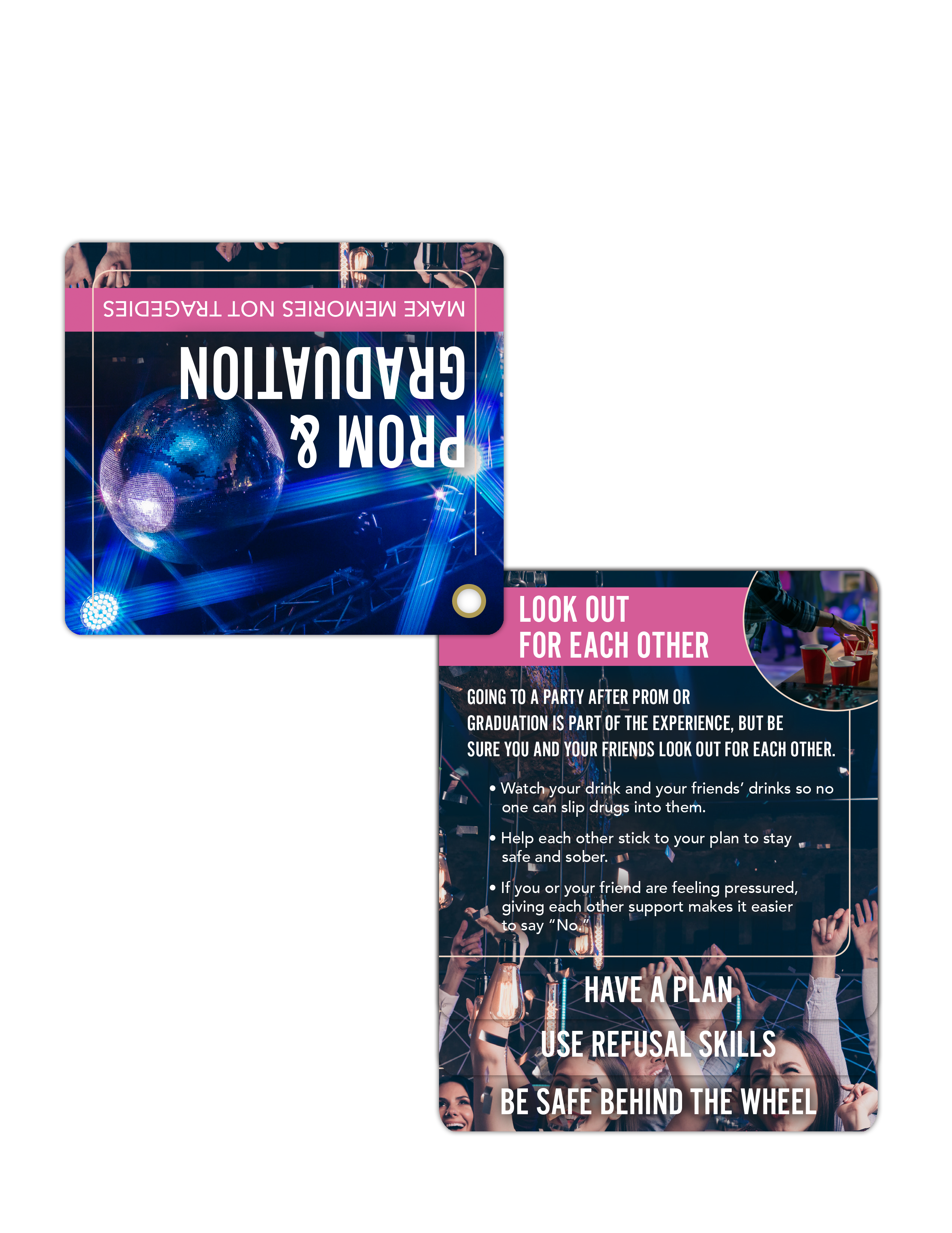 Promote smart choices with our Prom & Graduation Flip Tips. Your go-to guide for ensuring safe, memorable celebrations as teens embark on the journey to the next chapter of their lives! Flip through a curated collection of rotating cards, each delivering essential insights into responsible partying, personal safety, and refusal skills, while also creating lasting memories.