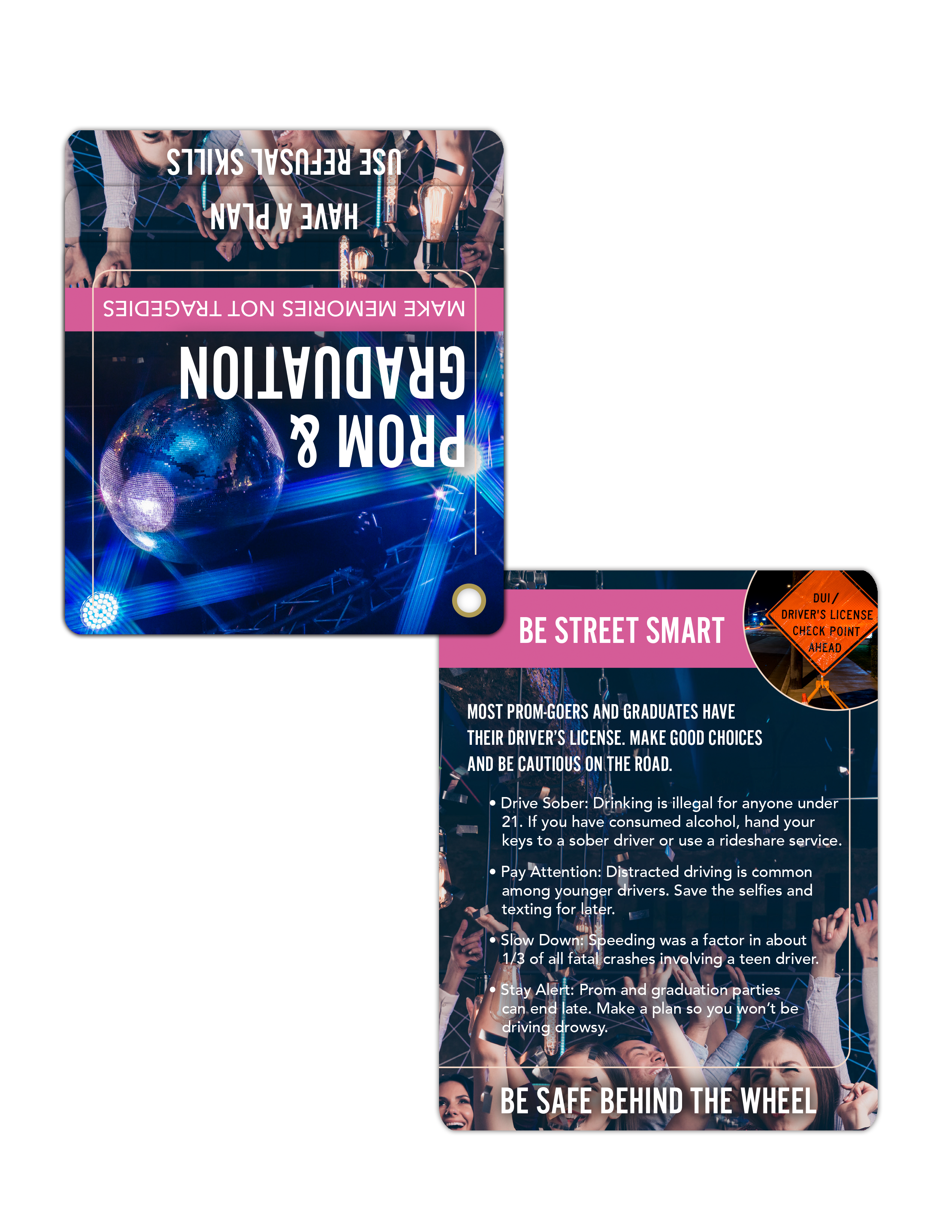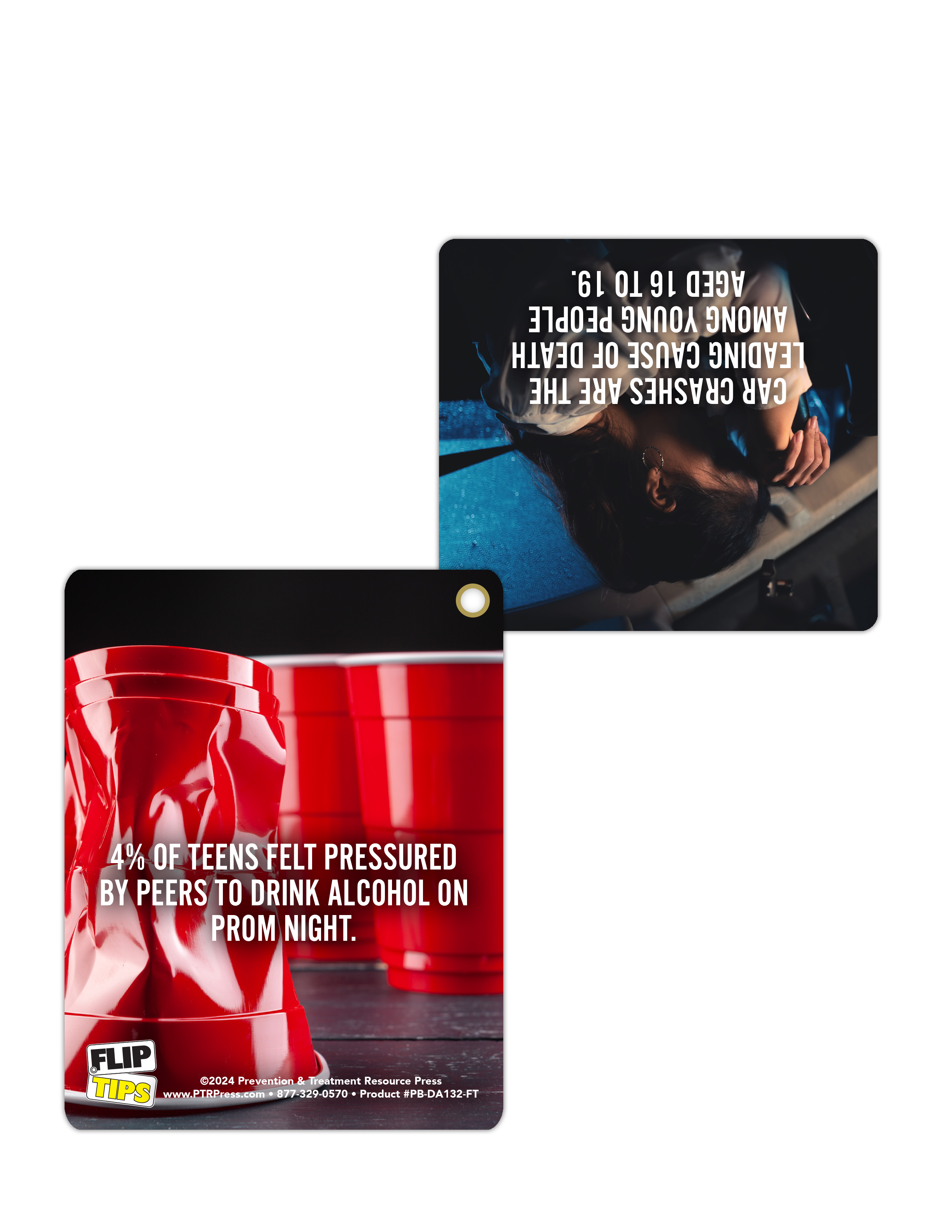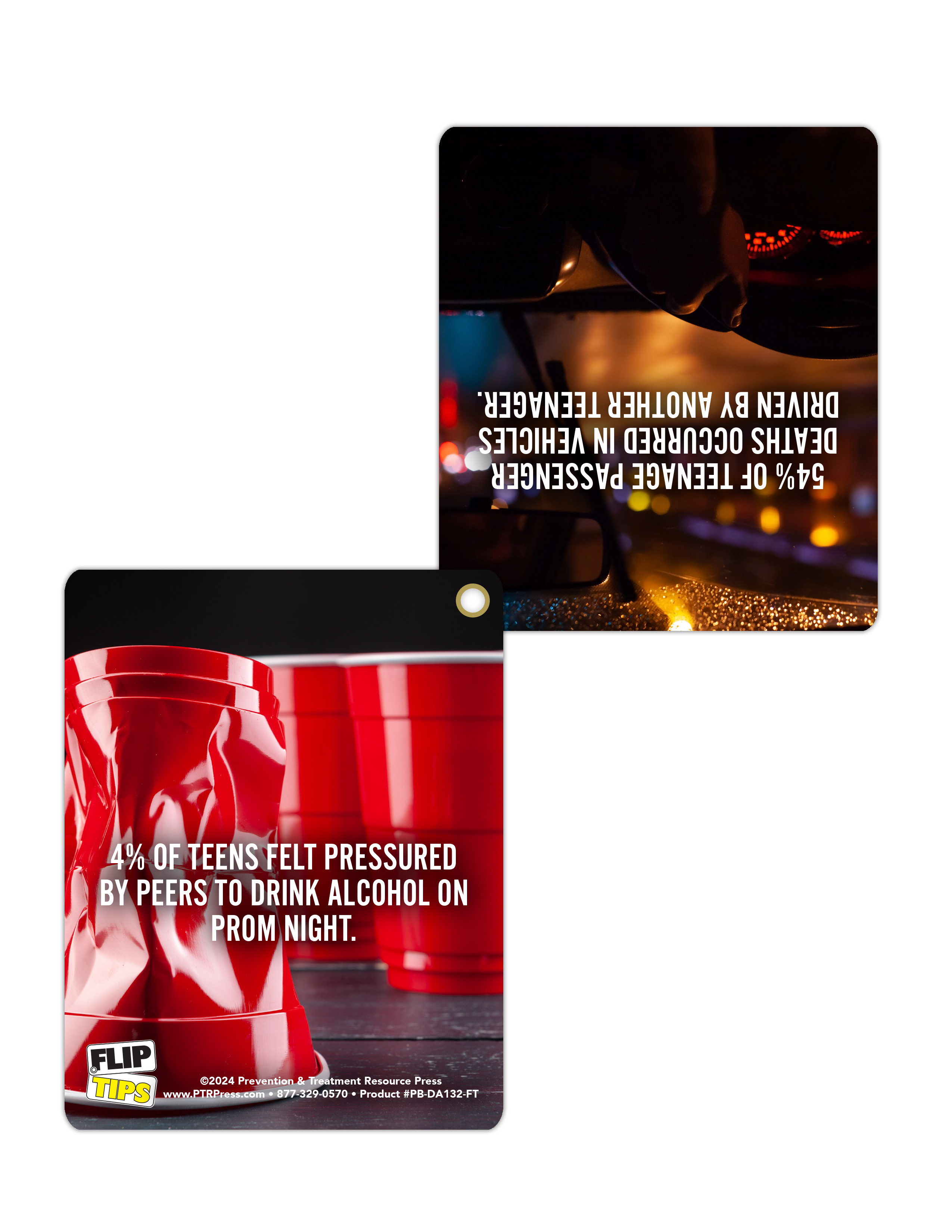 Promote smart choices with our Prom & Graduation Flip Tips. Your go-to guide for ensuring safe, memorable celebrations as teens embark on the journey to the next chapter of their lives! Flip through a curated collection of rotating cards, each delivering essential insights into responsible partying, personal safety, and refusal skills, while also creating lasting memories.