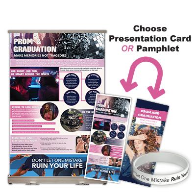 Promote safe celebrations with our all-in-one Prom & Graduation Tabletop Display Package! This package includes 1 tabletop display, 200 glow-in-the-dark wristbands, and a choice between 200 matching pamphlets or presentation cards to complement your display. Your choice! The combination of a visually striking tabletop display, glowing wristbands, and informative extras ensures that your message is not just seen but truly absorbed by your students.
