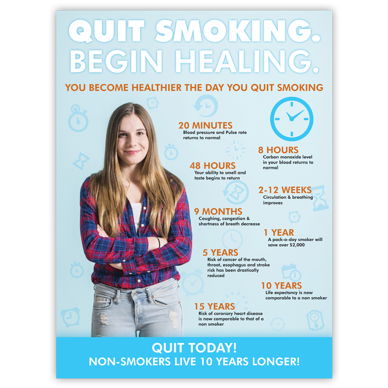 Showcase how the body heals overtime once someone stops smoking with this informative “Quit Smoking, Begin Healing” Poster. According to the American Cancer Society, smoking remains the single largest preventable cause of death and illness in the world. With this poster you can make an immediate visual impact to help inspire and educate your audience. These posters provide valuable information about the harmful effects of smoking and tobacco use, which can help individuals understand why quitting is so important for their health. With the help of these posters and a strong commitment to quit, readers can successfully kick the habit and live a healthier, smoke free life.