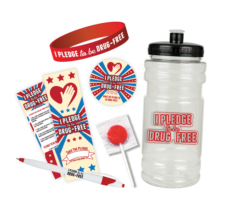 Each “I Pledge to be Drug-Free” Bottle Package includes a 20-ounce sports bottle pre-filled with: