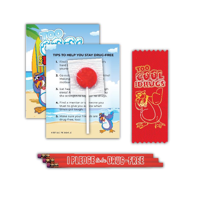 The Lollipop Card is a double-sided 5.5″ x 4.25″ card printed on heavy-duty card stock. The front of the card features themed artwork and a drug prevention message. The back of the card includes tips to help children make healthy choices and live drug-free. Attached to the card is a tasty cherry-flavored lollipop that rewards kids for committing to a drug-free life. The diameter of the lollipop is 7/8 inches. What’s more, this sweet treat ensures that children walk away from your red ribbon week celebration or drug prevention program with a smile on their faces.