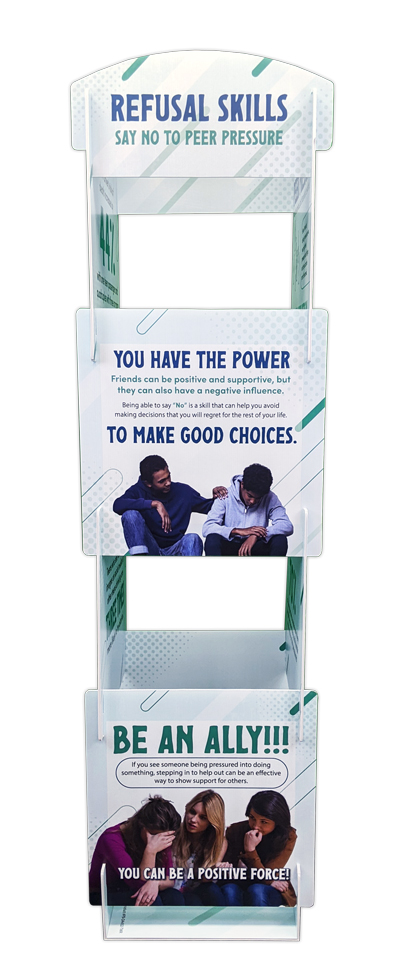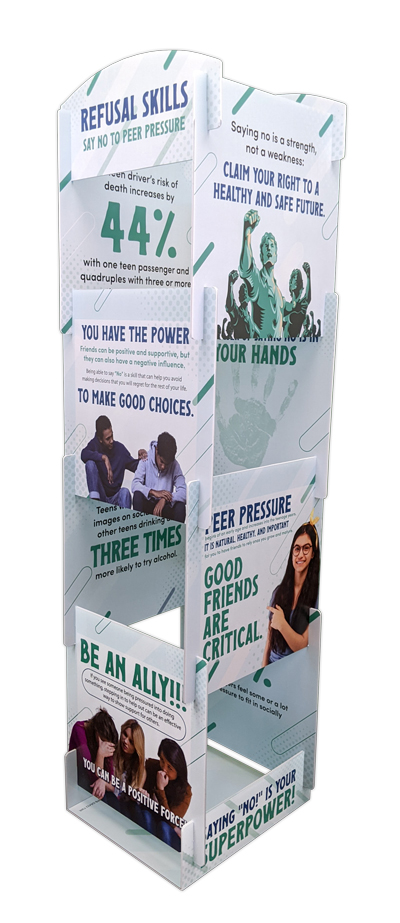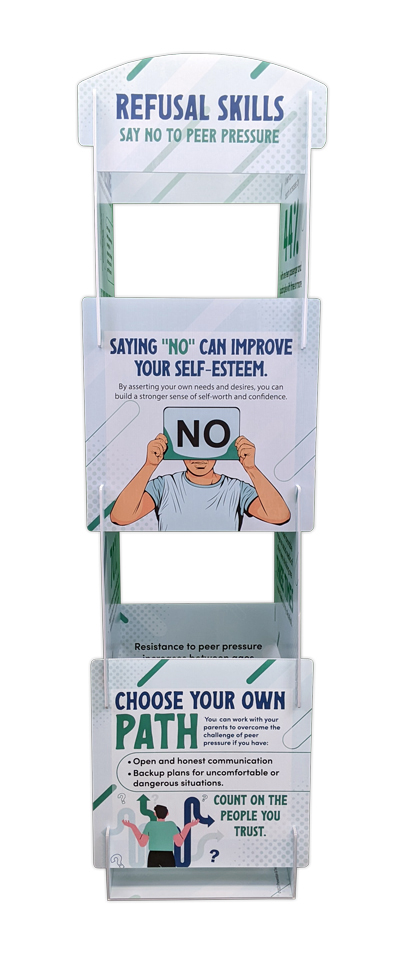 Educate and engage your community with this unique and innovative Refusal Skills: Say No To Peer Pressure Info Tower Display. This tower is a powerful tool for educators and community leaders to raise awareness about peer pressure. The versatile 4-sided 360-degree viewing angle design ensures that the information is visible from all angles. Making this tower a great tool for public events and gatherings. Whether it’s at a school, community centers, or health fairs, this tower attracts attention and starts important conversations about saying “no” in difficult situations.