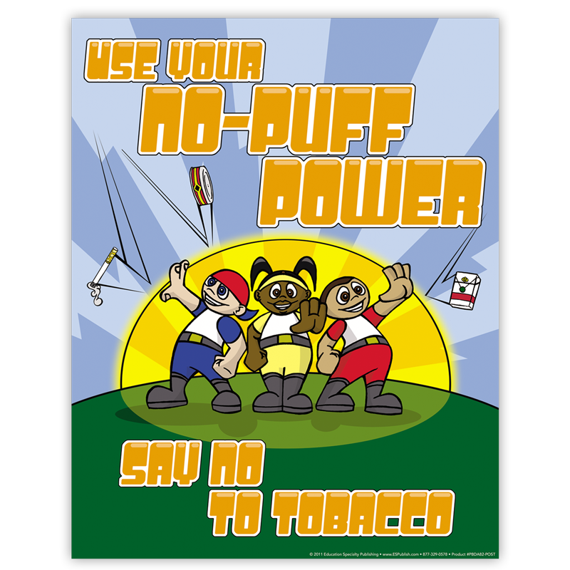 This full color poster sends the message: “Say No To Tobacco.” Anti-tobacco superheroes, the No-Puff Pals, Max, Sasha, and Lance, remind kids to use their No-Puff Power against tobacco in this colorful poster. Our primary goal is to keep our children safe and healthy. One way to achieve this is by educating them about the dangers of tobacco and nicotine at an early age. These posters are a valuable resource to help educate children about tobacco and remind them not to smoke tobacco. By using these posters, parents and caregivers can open up a dialogue with their children about the dangers of tobacco, creating a safe space for open and honest communication. Take a stand against smoking and order your posters today!
