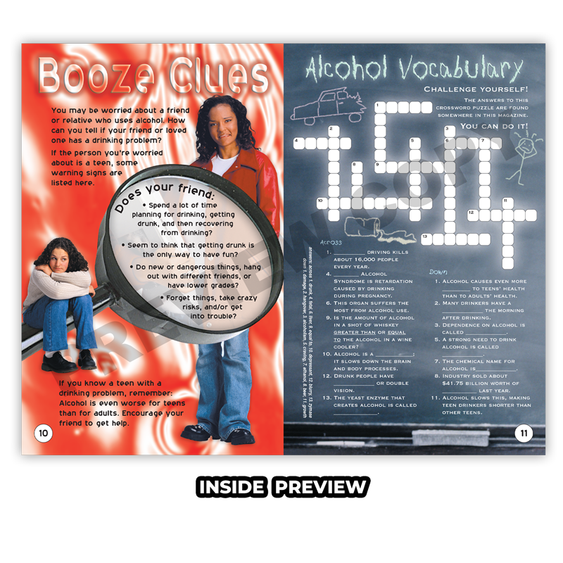 The facts about alcohol magazine is presented to pre-teens through creative special effects graphics, interesting text treatments and fun learning activities. This magazine helps students recognize and refuse kids that may pressure them to try using alcohol. It also provides useful information about resisting advertisements that make drinking look cool and fun. The magazine includes short and long term effects, as well as the types of alcohol and their differences. Reinforcing the lessons with puzzles, mazes, word fill-ins and much more. Students will learn the mental, physical, emotional and social dangers of using alcohol. “Alcohol: Drug Undercover” is a great tool for introducing lessons about the dangers of drinking alcohol and make them stick.