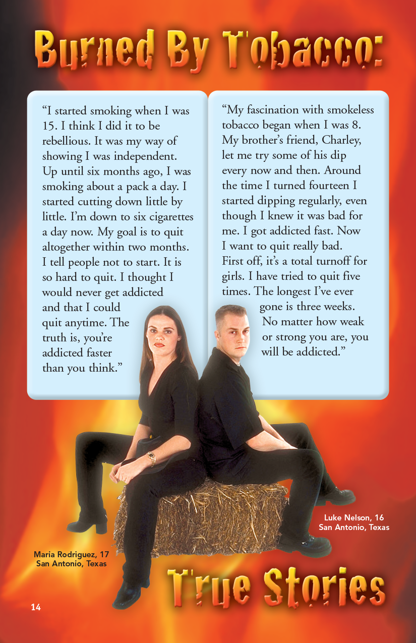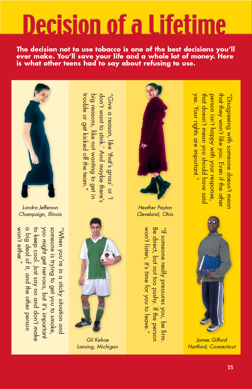 Appealing to teenagers’ sense of reason, this “Say No” prevention magazine provides a compelling overview of tobacco. It compares tobacco advertising images sent to the public with the characteristics of real people who use tobacco. Readers will learn about the addictive power of nicotine and the various consequences of tobacco use. It describes the symptoms of nicotine addiction and withdrawal and also gives facts and quotes from various sources that prove the decision to use tobacco to be the “decision of a lifetime.”