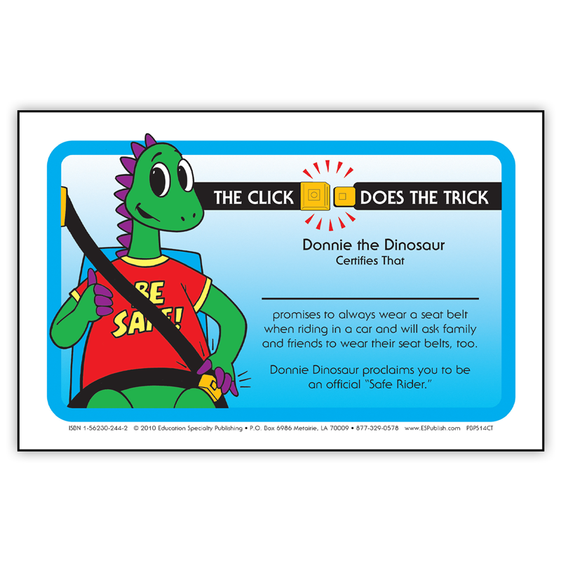 Children can commit to using seat belts with Donnie Dinosaur’s The Click Does the Trick Safety Certificate. Great to hand out after seatbelt safety programs!