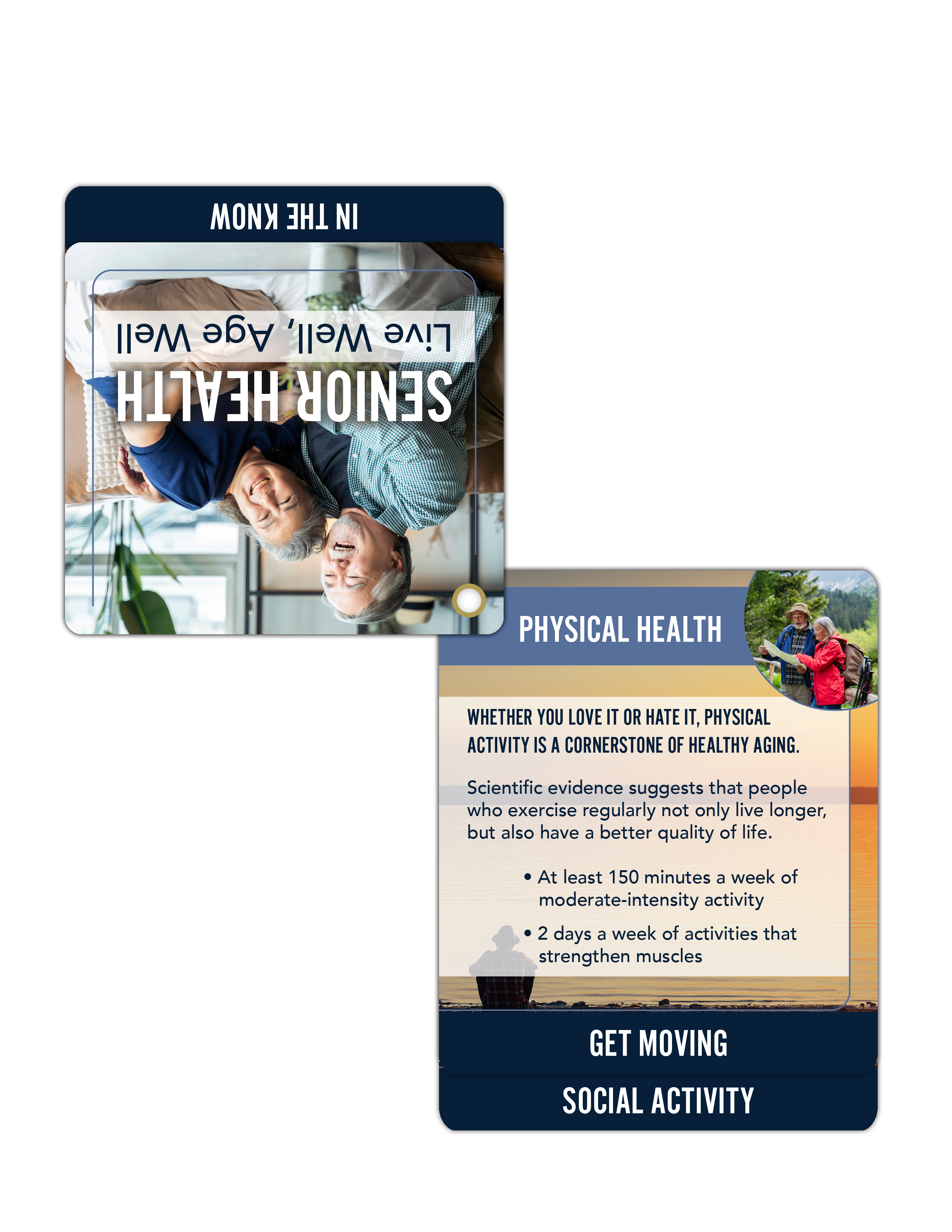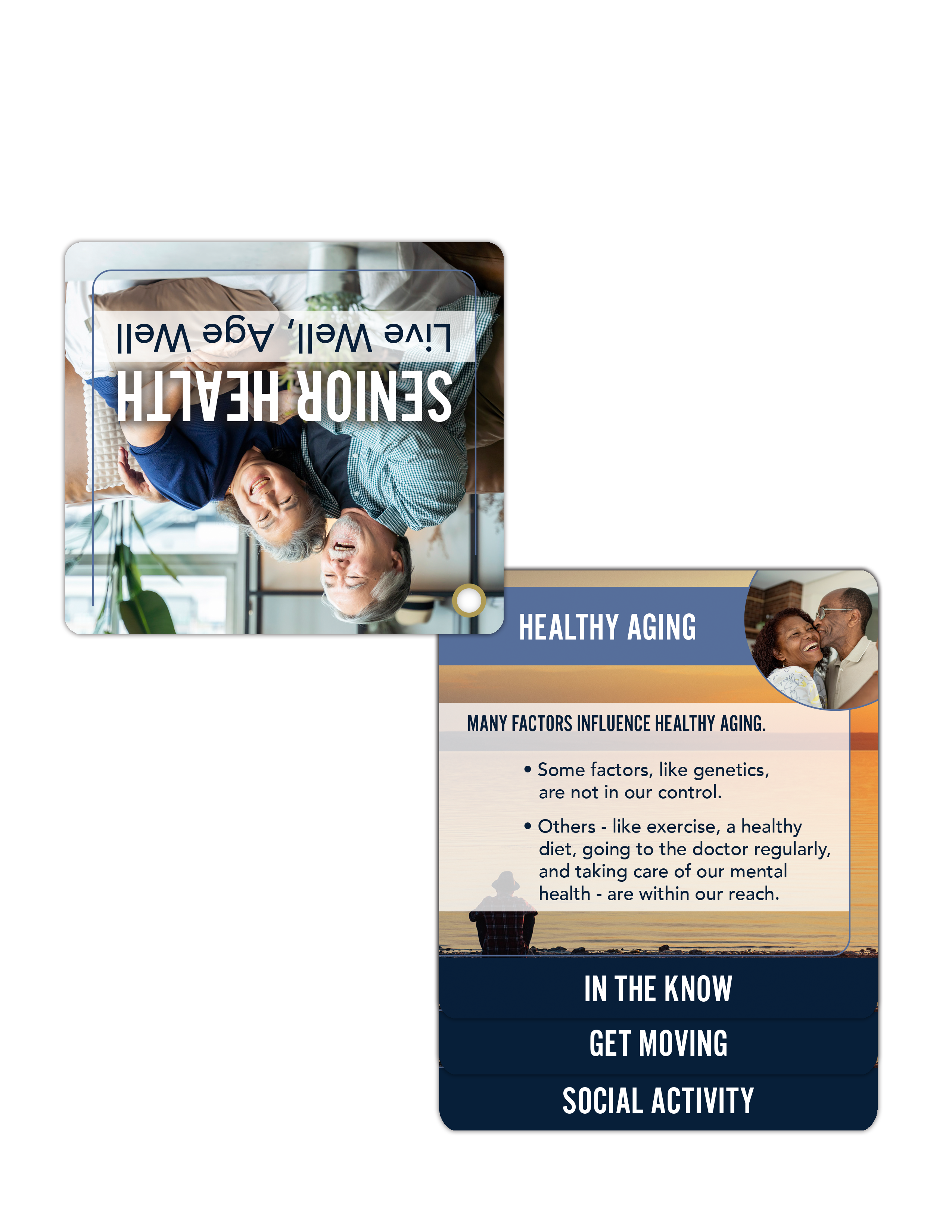 Dive into the fountain of vitality with our Senior Health: Live Well, Age Well Flip Tips. The ultimate guide for hosting vibrant health and wellness events! Flip through a curated collection of rotating fact cards, each serving up bite-sized information and vibrant visuals to inspire seniors to live their best lives.