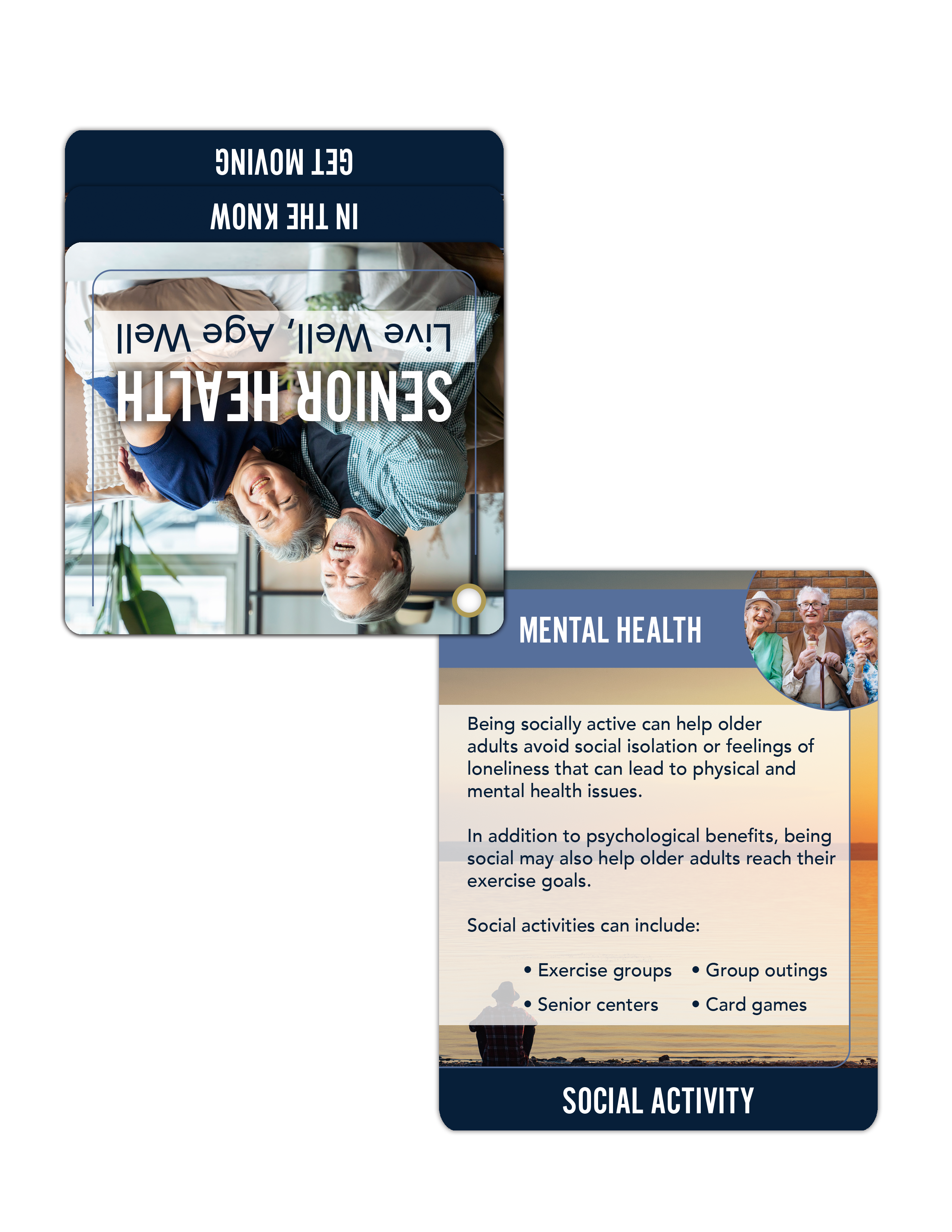 Take the tips on the road! Strategically distribute these flip tips at senior centers, health fairs, fitness classes, and community events to directly connect with older adults. Whether at retirement communities or local libraries, these engaging tips will be a hit, ensuring seniors light up with health and wellness wisdom, one flip at a time!