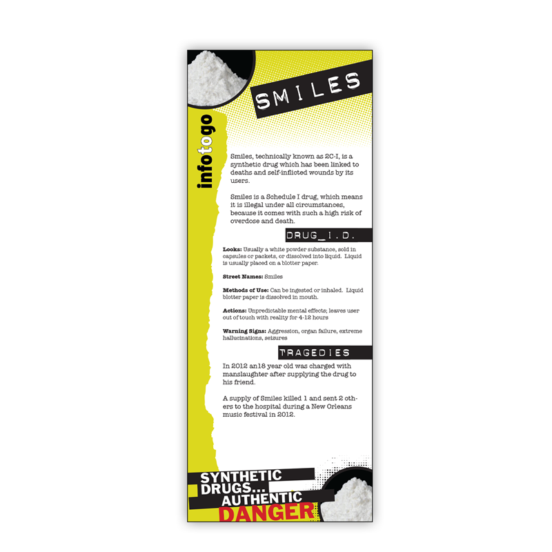 This educational rack card gets straight to the point about the dangerous synthetic drug “Smiles.” Technically known as 2C-I, this drug has been linked to overdose, deaths, self inflicted wounds, assault, and even murders. These rack cards are your key to delivering critical information in a clear, concise, and engaging manner.
