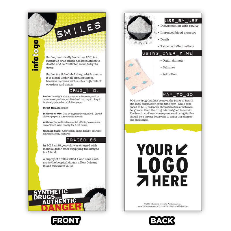 A great handout for community events and presentations, your audience will grasp the serious dangers of “Smiles” like never before. What’s more, you can personalize it with your organization’s name and logo, creating a unique connection with your audience.