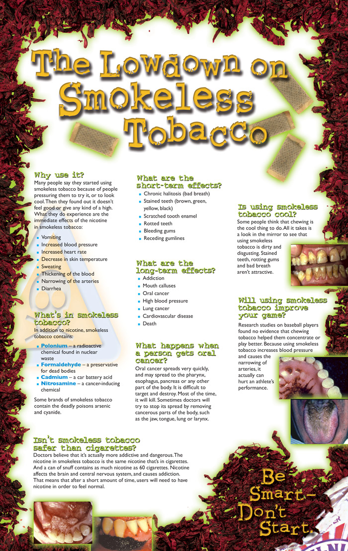 Underscoring the point that it is a revolting habit to others as well as dangerous to its users. The pamphlet includes several photos graphically documenting the deterioration of teeth and gums. Plus the white patches on gums that are precursors to oral cancer. The short and long term health effects of dip are also documented. To include rotted teeth, high blood pressure, and cardiovascular disease.