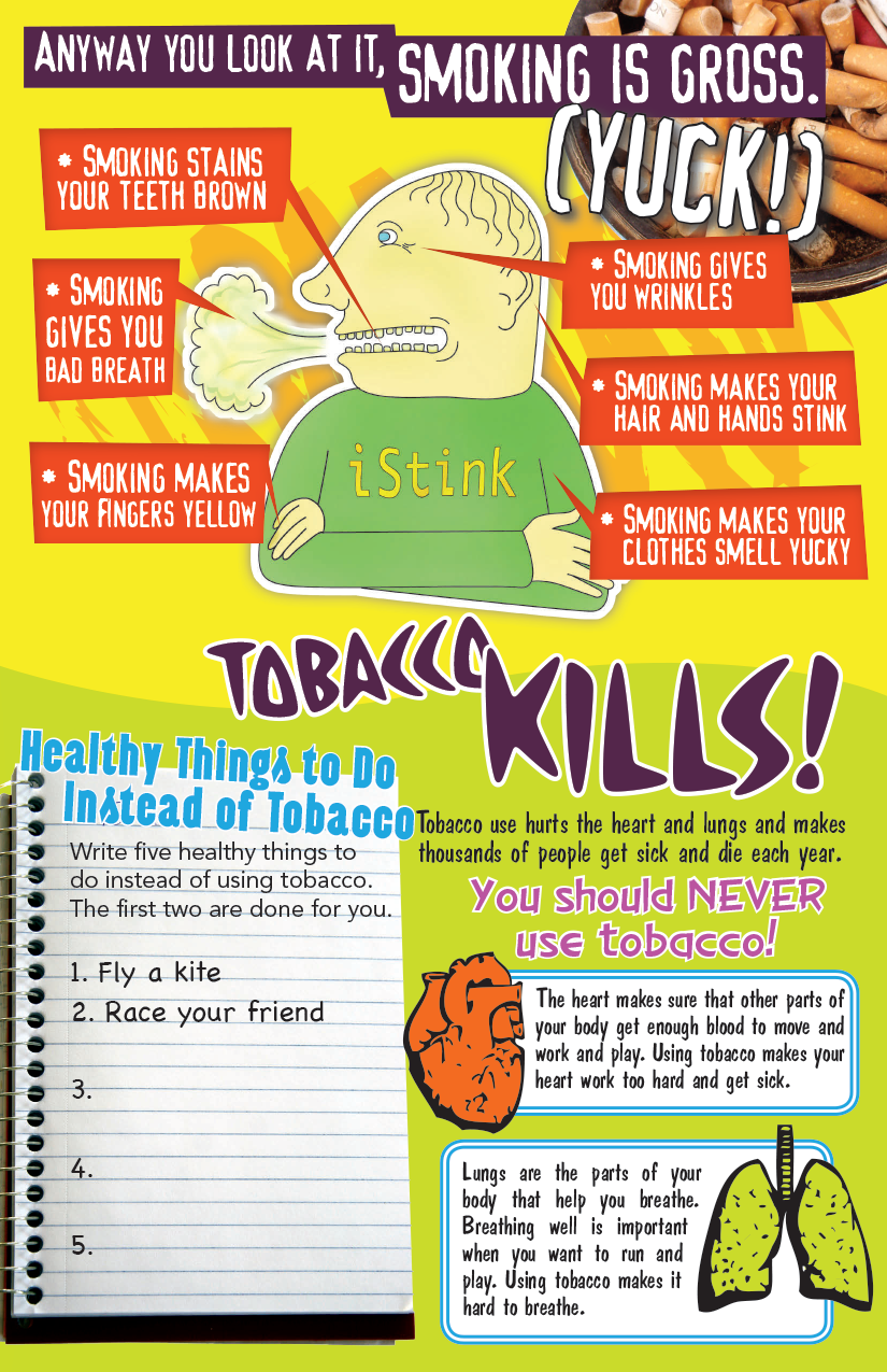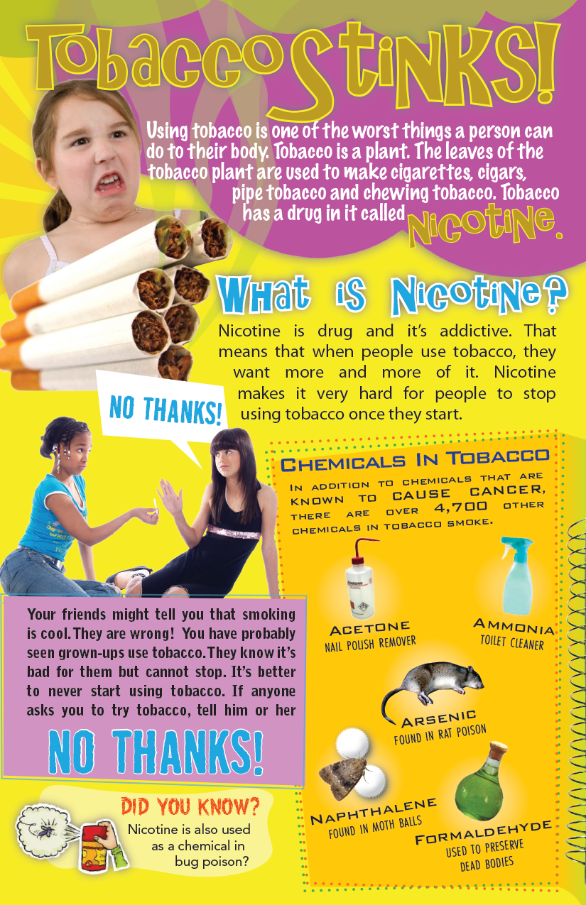 The effects of alcohol are explored along with the long term side effects on the body. A section on tobacco explains nicotine and addiction. It covers what other chemicals are in tobacco, as well as some of the nasty effects using tobacco has on health and appearance.