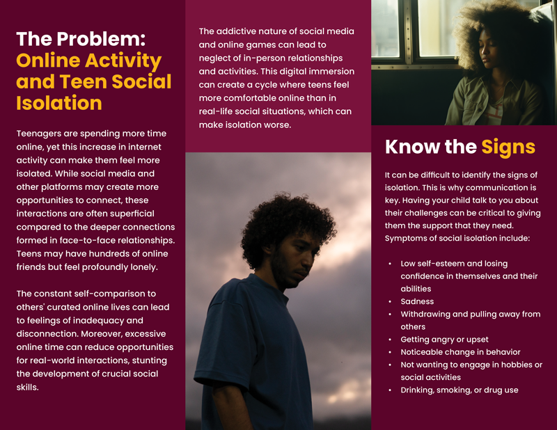 With the Social Isolation Online: Understanding the Paradox Pamphlet, you’re not just raising awareness, you’re creating opportunities for connection. Help families to turn virtual interactions into stepping stones toward stronger, more supportive relationships. Because no teen should feel alone, even in a world of infinite connections.