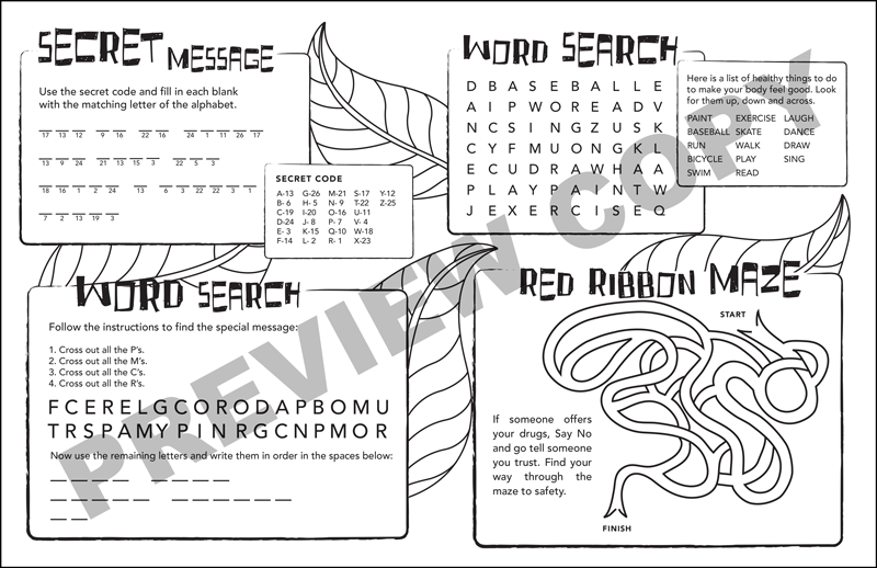 - Decoding, fill-in-the-blank activity where children will use a secret code to reveal the sentence, “Say no to drugs and make the world a better place”