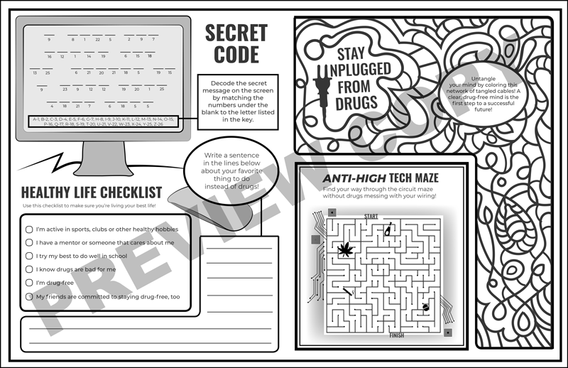 This “Stay Unplugged from Drugs” activity sheet are filled with word puzzles, interactive games, and important drug prevention tips. Unplug from the negativity of drugs and plug into an exhilarating adventure filled with fun! These adorable Red Ribbon Week themed sheets empower kids to make smart choices and say YES to a bright, drug free future. These engaging sheets include a word search, maze, secret messages, and coloring activities. As kids tackle these awesome activities, they’ll learn all about the importance of staying away from drugs and making healthy choices. With each puzzle they solve and color they create, they’ll be building a strong and healthy foundations.
