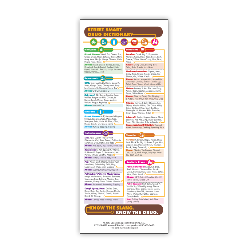 Clarify drug terms with our Street Smart Drug Dictionary Presentation Cards. These easy-to-read cards provide a comprehensive guide to the ever-evolving slang used in the world of substance abuse. Whether you’re a parent, educator, or community advocate, understanding these terms is a critical first step in identifying and addressing potential issues before they escalate.