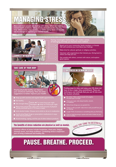 Tackle stress head-on with our Stress Management Tabletop Display. Your ultimate tool for creating a stress-free and engaging awareness event! This retractable display offers a visual feast of easy-to-follow strategies, from taking care of your body to mindful breathing techniques. Educators can use these tips not only for themselves but also incorporate them into their classrooms or events, promoting a healthy and stress-free environment.