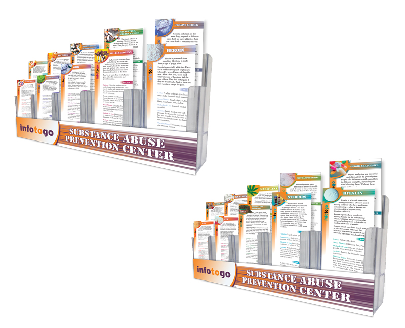 This Info To Go Substance Abuse Info Center offers individuals the information they will need to be able to make an educated decision when faced with the question of drugs. Each rack card identifies a particular type of drug, its varieties, street names, signs of use, prevalence, and impact on society, and the effects on the body and mind, concluding with a motivational “Way to Go” anti-use message.