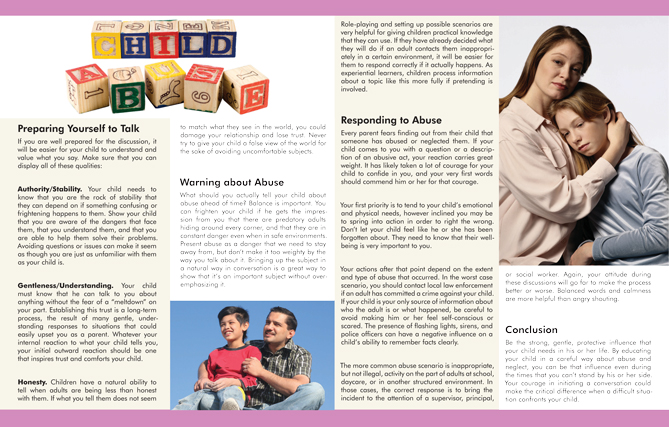 Each pamphlet is crafted to give practical tips on when and how to introduce the conversation about abuse, as well as suggestions for creating an environment where kids feel comfortable sharing their feelings. It includes child-friendly language, strategies to explain boundaries, and ways to encourage children to speak up if they ever feel uncomfortable.
