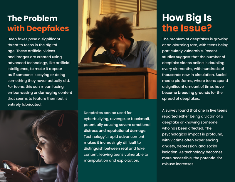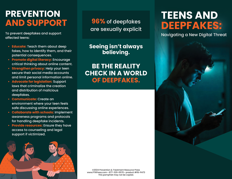The rise of deepfakes has brought incredible technology, but also serious risks. Help teens and their families navigate the digital maze and unmask the digital truth with our Teens & Deepfakes: Navigating a New Digital Threat Pamphlets. This eye-opening guide unravels the mysteries of deepfakes, explaining what they are and the dangers they pose to privacy, reputation, and trust online.