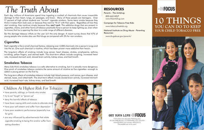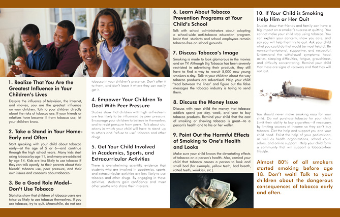 The pamphlet also address which children are at the highest risk for tobacco use and what parents can do about it. Altogether, a thorough and comprehensive resource that will be of great value to parents.