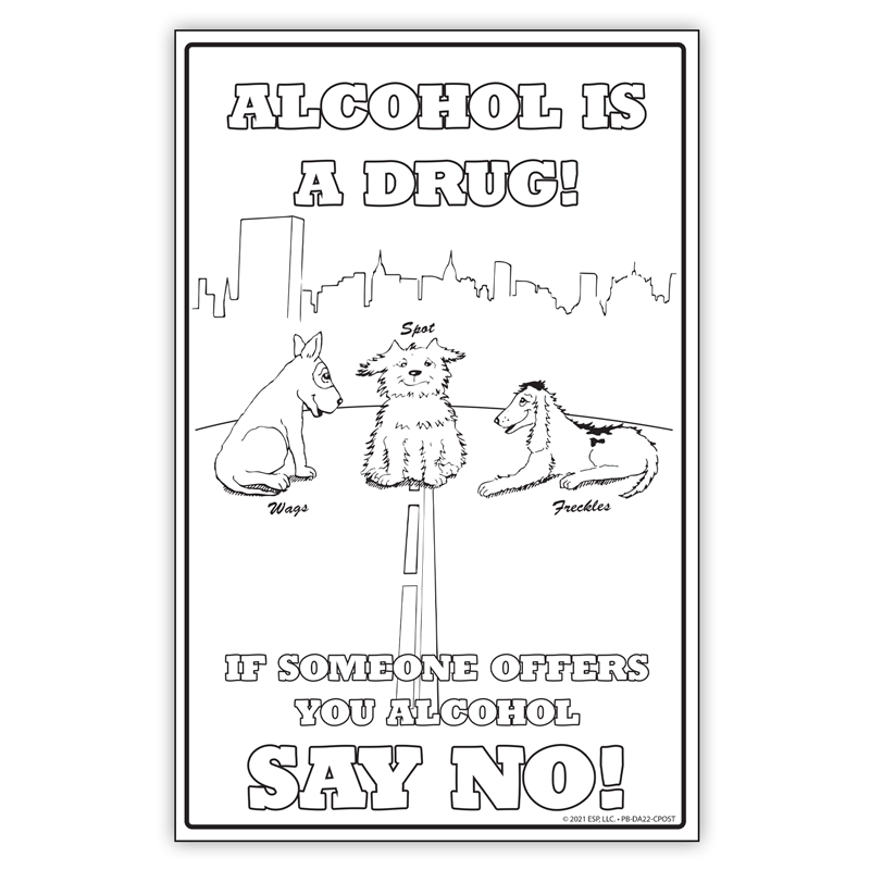 The color me poster features Wags, Freckles and Spot together with a big, bold message “alcohol is a drug!” and “if someone offers you alcohol SAY NO!” The cute 11″ by 17″ poster is large with bold graphics that is perfect for coloring. This poster is a great way to promote alcohol prevention and awareness to the younger age groups. What’s more, these fun color me posters are affordable and easy to hand out! Definitely a great way to help enhance the success of your alcohol awareness and prevention campaign!