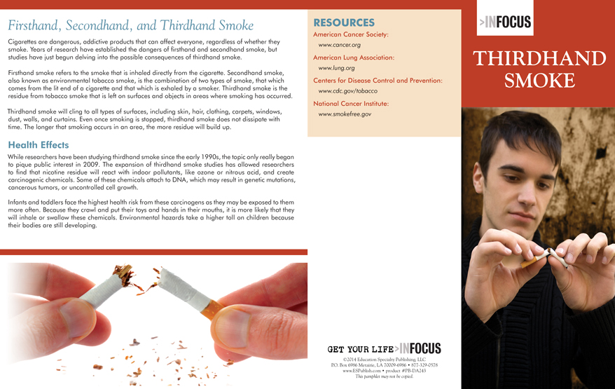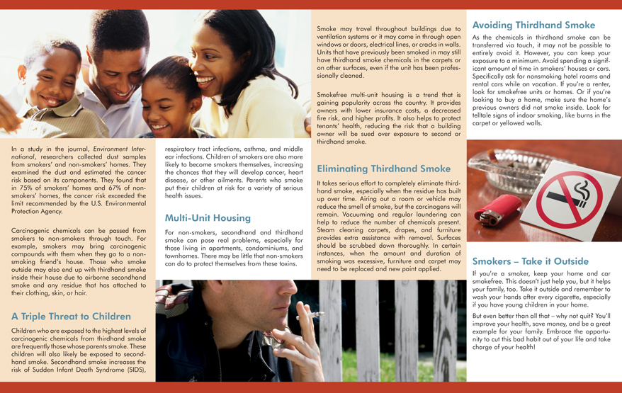 Thirdhand smoke is a topic that has only recently begun to pique public interest. Thirdhand smoke is the tobacco residue that is left behind on all surfaces from cigarette smoke. This thirdhand smoke pamphlet covers all the need to know information on this emerging topic of concern.