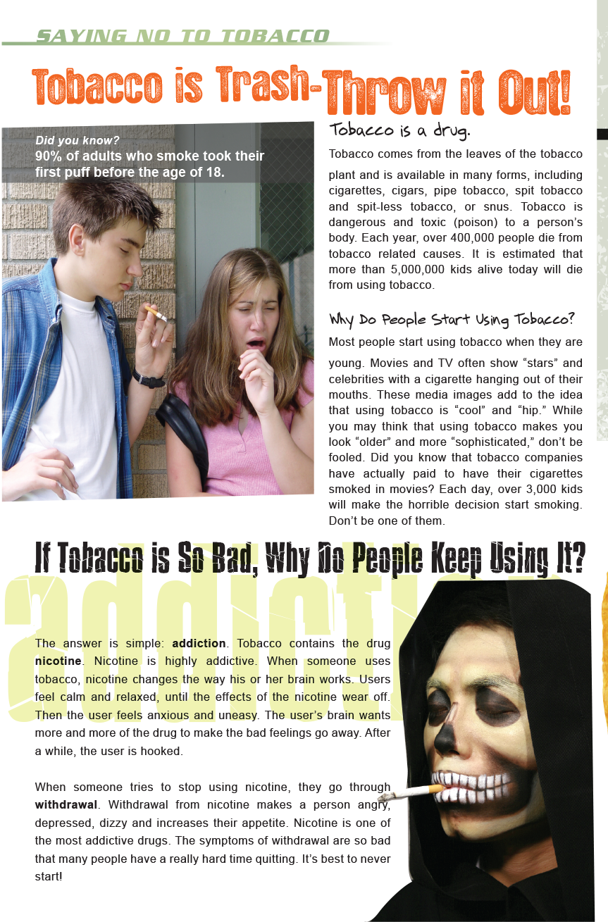 A section on tobacco explains that tobacco is a drug and has the highly addictive chemical, nicotine, as its active ingredient. Addiction to tobacco is explored in detail, as well as the short and long term effect of tobacco use. It also includes a section on smokeless tobacco, explaining that these products are not a safe alternative.