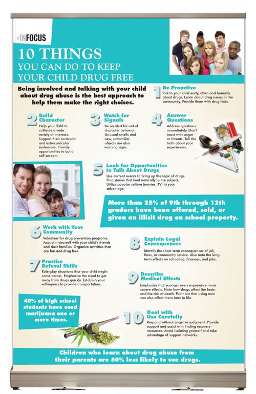 Help parents and communities take a stand against substance abuse with 10 practical tips to keep children drug free. The ideal resource for promoting healthy, drug-free lifestyles among kids. Whether you’re hosting an awareness event, school program, or community outreach, this display provides straightforward and effective strategies that help parents and guardians to guide children away from drug use.